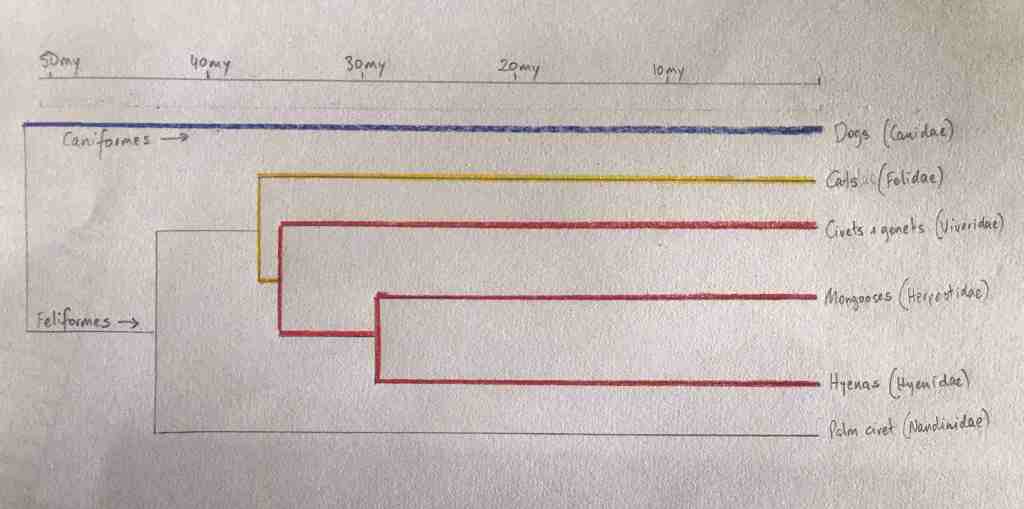 There’s an age-long debate I hear about whether hyenas are dogs or cats. They do look a bit more like dogs but they are actually in their own family called the Hyena family. The hyena family is in a big group of carnivores called the Feliformes. The other big group is the Caniformes and that’s where dogs are, so hyenas are more closely related to cats than dogs. But that’s not the full story. Hyenas are actually more closely related to the mongoose family, and then to civets and genets than they are to cats. Here’s what the family tree looks like: