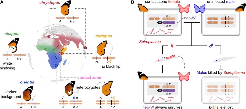 Hii ramani inaonyesha rangi tofauti za aina za African Monarch tofauti na namna Spiroplasma inavyoondoa matokea ya dume wenyeji.