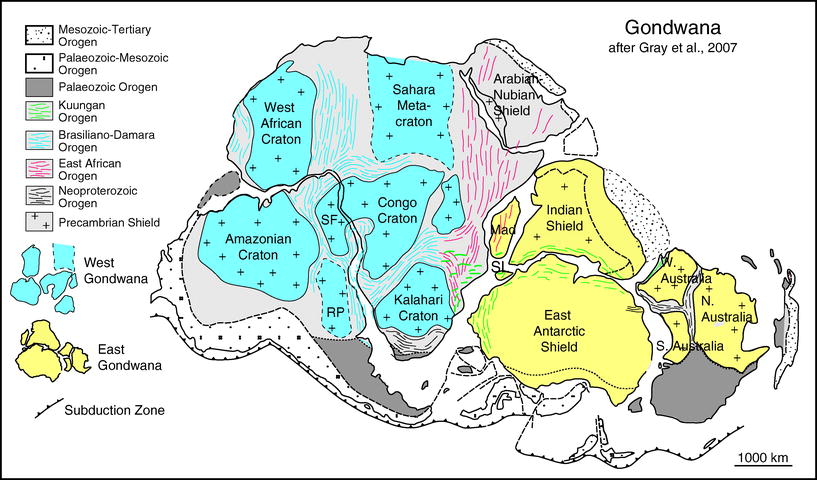 Source: Meert J.G. (2011) Gondwanaland, Formation. In: Reitner J., Thiel V. (eds) Encyclopedia of Geobiology. Encyclopedia of Earth Sciences Series. Springer, Dordrecht. https://doi.org/10.1007/978-1-4020-9212-1_92