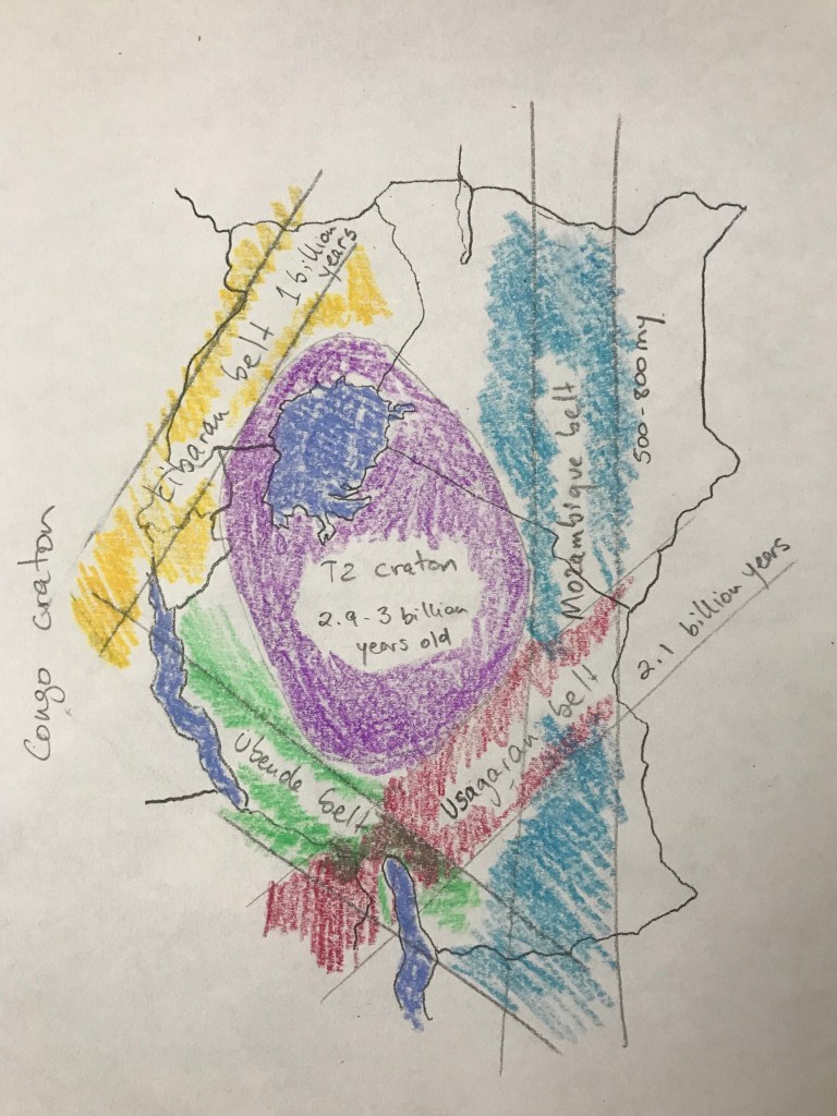 The oldest rocks we find in East Africa make up cratons. A craton is an old piece of continental crust that is tectonically stable. Sub-saharan Africa as we know it know, is made up of three old cratons- the Congo craton and Southern African craton which are massive, and then a smaller craton called the Tanzania craton. The oldest rocks in the Tanganyika craton are about 2.9-3.0 billion years old and took a billion years to form.